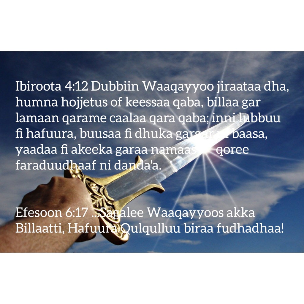 - Ibiroota[Hebrews][እብራውያን][Cibraaniyada] 4:12 Dubbiin Waaqayyoo jiraataa dha, humna hojjetus of keessaa qaba, billaa gar lamaan qarame caalaa qara qaba; inni lubbuu fi hafuura, buusaa fi dhuka gargar ni baasa, yaadaa fi akeeka garaa namaas qoree faraduudhaaf ni danda’a.