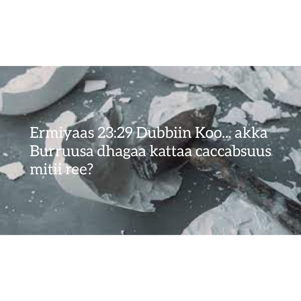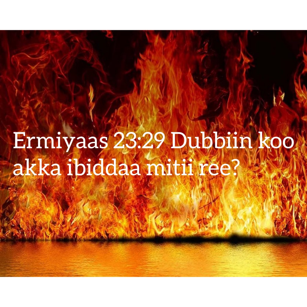 - Ermiyaas [Jeremiah][ኤርምያስ][Yeremyaah] 23:29 Dubbiin Koo akka ibiddaa mitii ree? Akka burruusa dhagaa kattaa caccabsuu mitii ree?