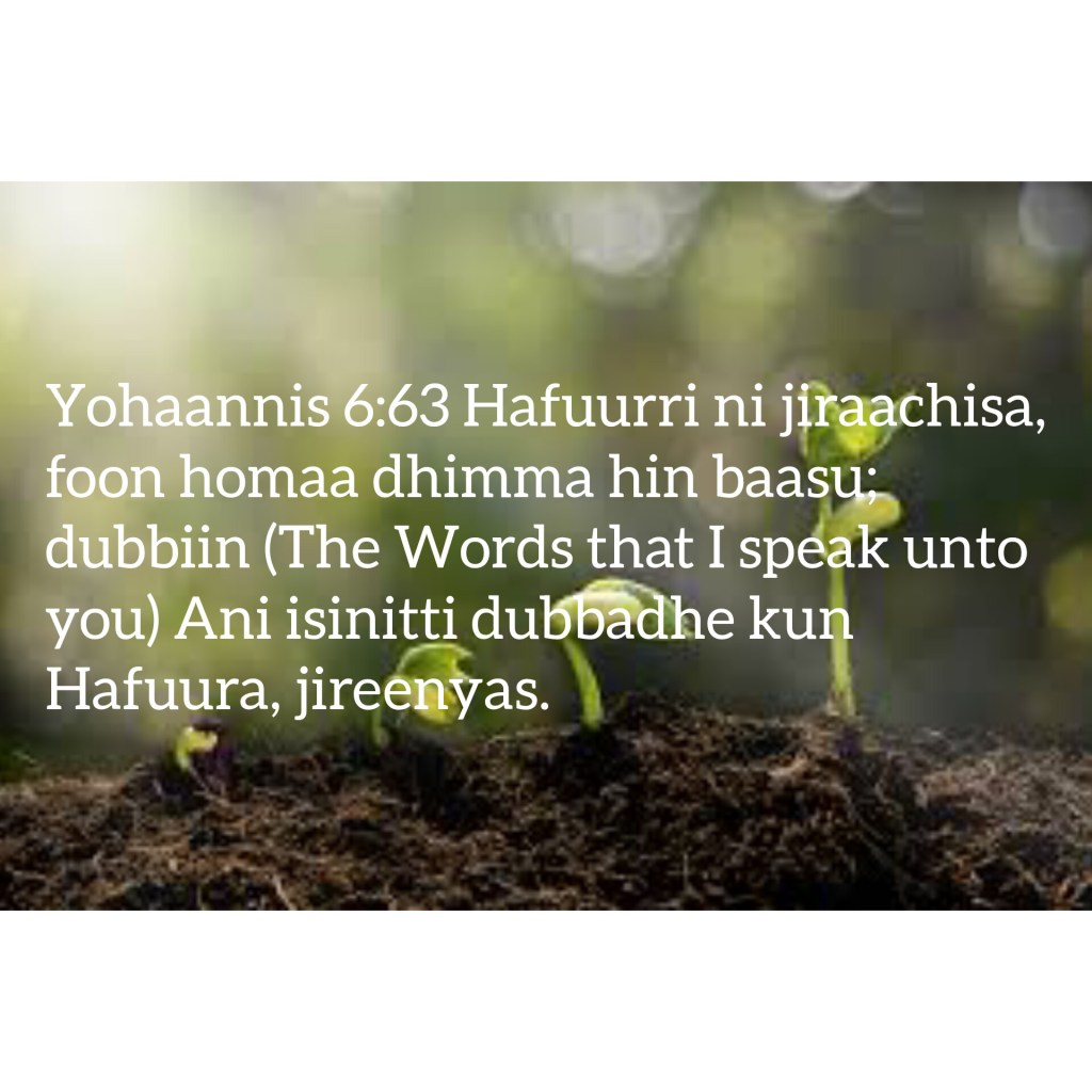 - Yohaannis[John][ዮሐንስ][Yooxanaa] 6:63 Hafuurri ni jiraachisa, foon homaa dhimma hin baasu; Dubiin (the words that I speak unto you) Ani isinitti dubbadhe kun Hafuura, jireenyas.