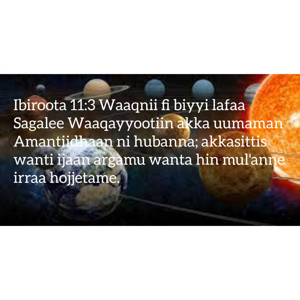 - Ibiroota[Hebrews][እብራውያን][Cibraaniyada] 11:3 Waaqnii fi biyyi lafaa Sagalee Waaqayyootiin akka uumaman amantiidhaan ni hubanna; akkasittis wanti ijaan argamu wanta hin mul’anne irraa hojjetame.
